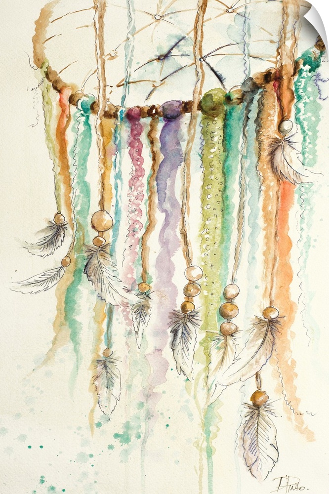 <p>Painting of a dream catcher with cords of varying color and feathers tied to the ends.</p>