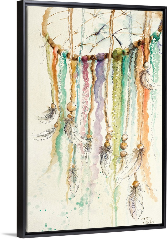 <p>Painting of a dream catcher with cords of varying color and feathers tied to the ends.</p>