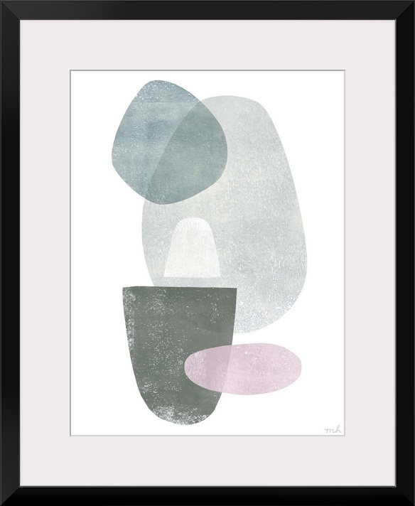 <p>Abstract art with overlapping shapes in blue, pink, white, and grey hues on a white background.</p>
