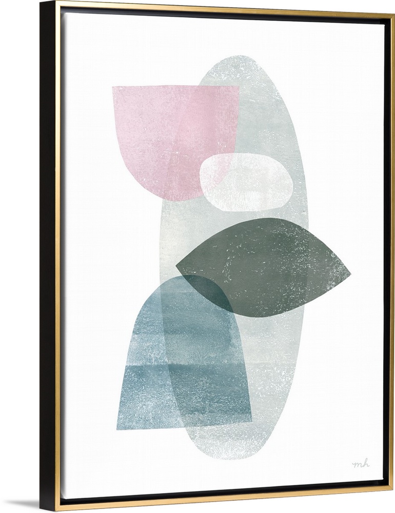 <p>Abstract art with overlapping shapes in blue, pink, white, and grey hues on a white background.</p>
