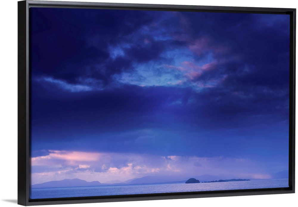 <p>Fine art photo of a deep blue sky with storm clouds over the ocean.</p>