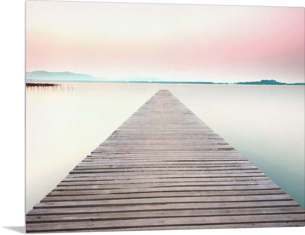 <p>Illustration of a wooden pier leading to the middle of a clam and peaceful lake with a pink sunset above.</p>