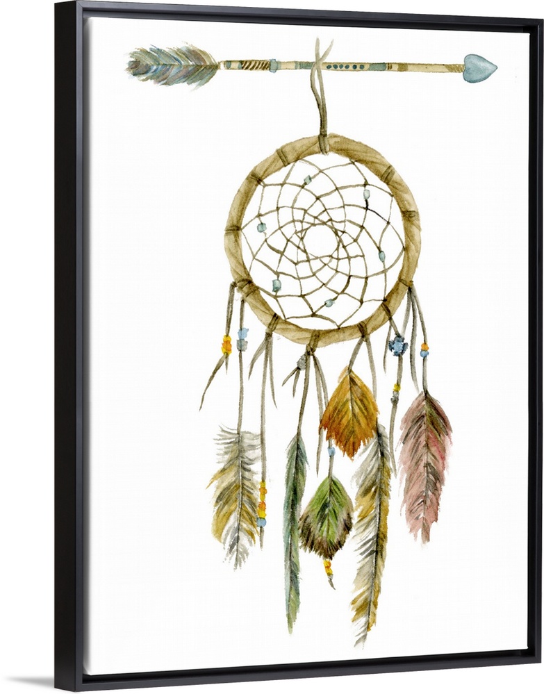 <p>Decorative painting of a dream catcher with feathers hanging from the bottom and an arrow holding it up at the top.</p>