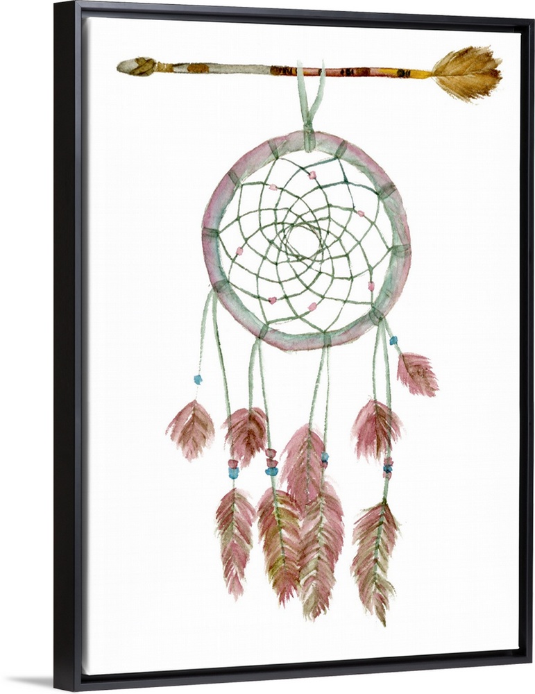 <p>Decorative painting of a dream catcher with feathers hanging from the bottom and an arrow holding it up at the top.</p>
