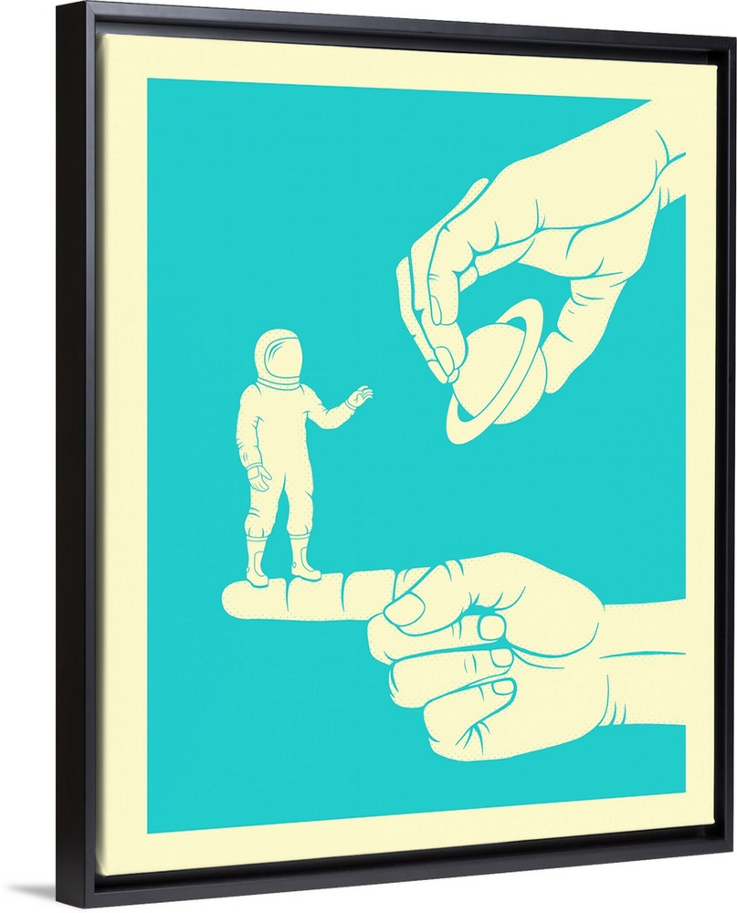<p>Bright blue and cream conceptual illustration of an astronaut standing on a finger and reaching for Saturn, which another hand is holding.</p>