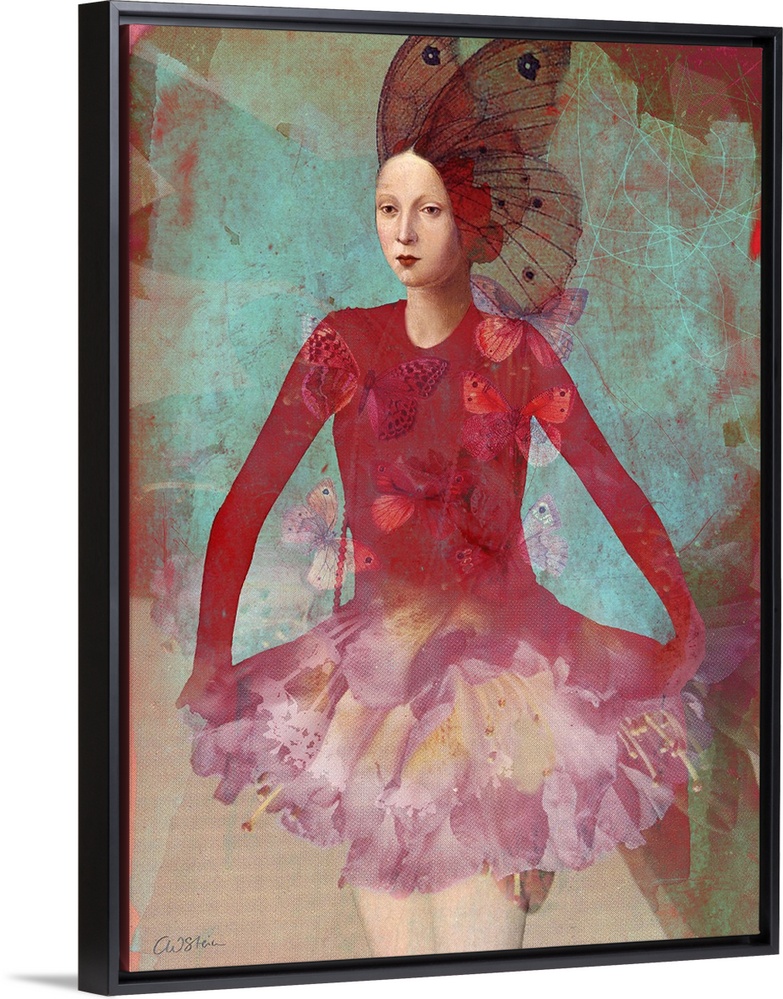 <p>A woman in red, with a flower for a skirt, has a large butterfly on her head and others flying around her.</p>