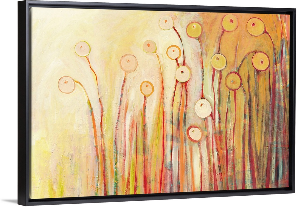 <p>This horizontal abstract painting shows pastel color flower pods on a radiant backdrop.</p>