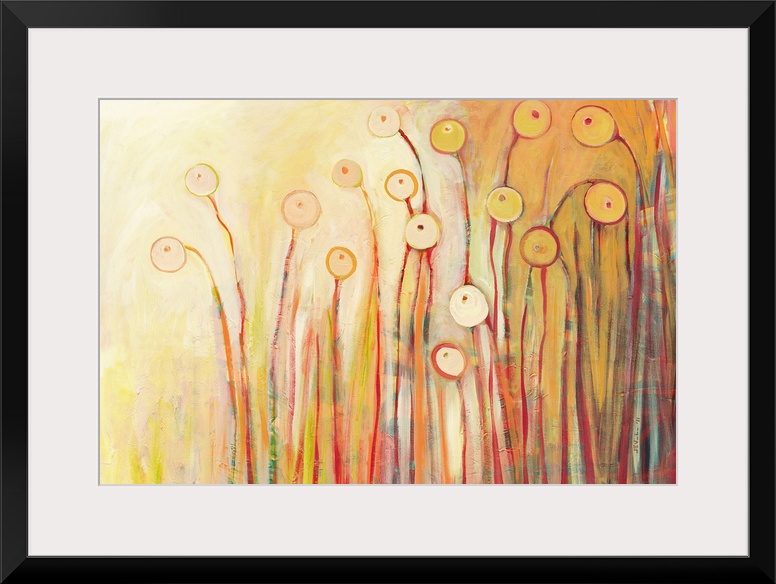 <p>This horizontal abstract painting shows pastel color flower pods on a radiant backdrop.</p>