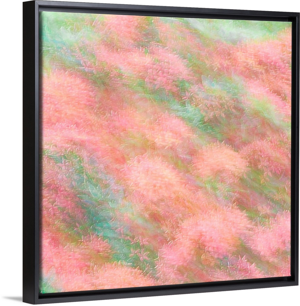 <p>Dreamy photograph of pink flowers in a field with blurred movement and a pastel colored background.</p>