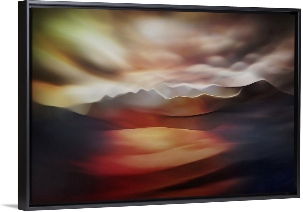 <p>Abstract landscape. The original is a studio shot of water reflecting colors. The shape of the mountains was created in post-processing by transforming the existing color areas in the photo. The image is an interpretation of what the Rocky Mountains look like at sunset as seen from the distance. Ursula Abresch Fantastic Landscapes Collection</p>