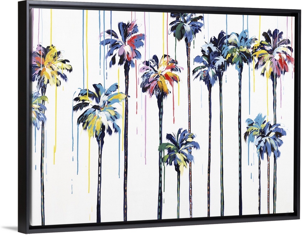 <p>Colorful palm trees with thin tree trunks on a white background with paint dripping from the top.</p>