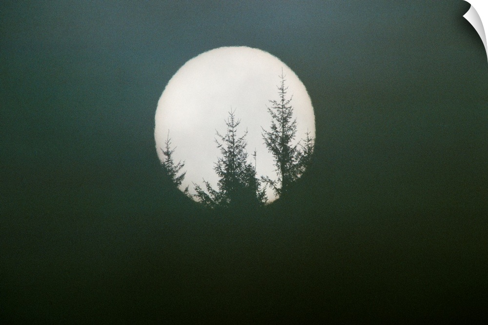 <p>Douglas firs are silhouetted by a rising full moon, Washington.</p>