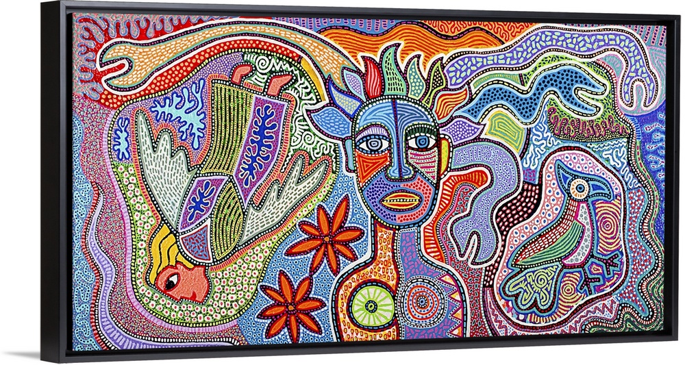 <p>Contemporary aboriginal inspired artwork with bright colors and intricate detail.</p>