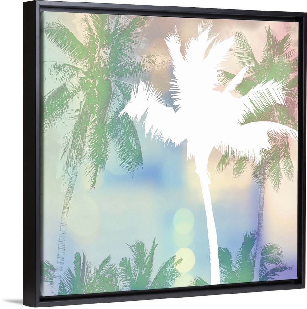 <p>White palm tree silhouette over pastel palms and bokeh lights.</p>