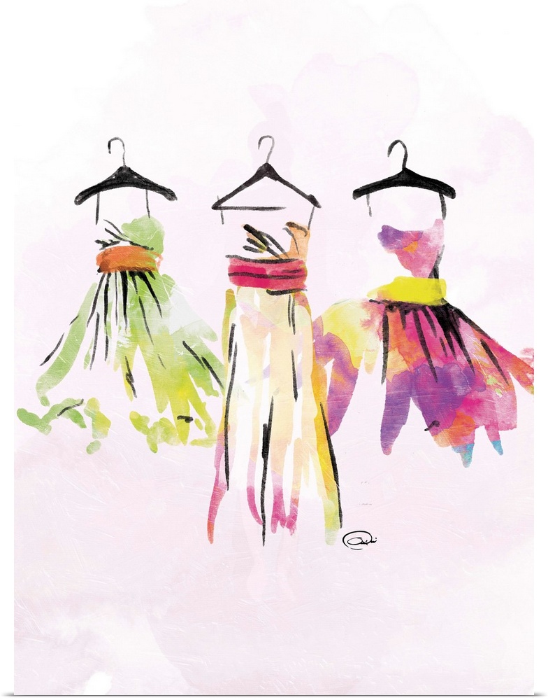 <p>Contemporary watercolor artwork of colorful dresses hanging on black hangers against a pale pink background.</p>