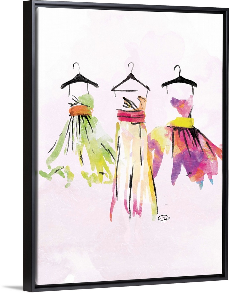 <p>Contemporary watercolor artwork of colorful dresses hanging on black hangers against a pale pink background.</p>