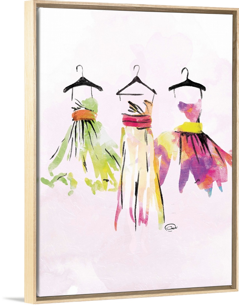 <p>Contemporary watercolor artwork of colorful dresses hanging on black hangers against a pale pink background.</p>