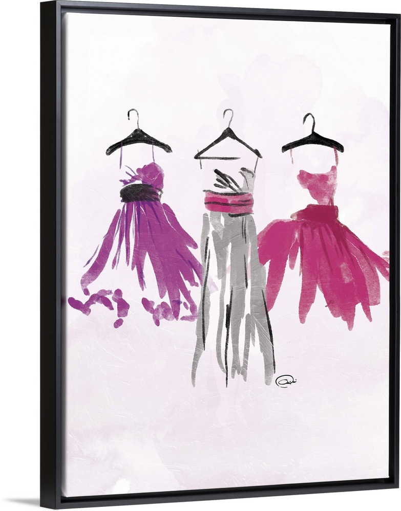 <p>Contemporary watercolor artwork of colorful dresses hanging on black hangers against a pale pink background.</p>