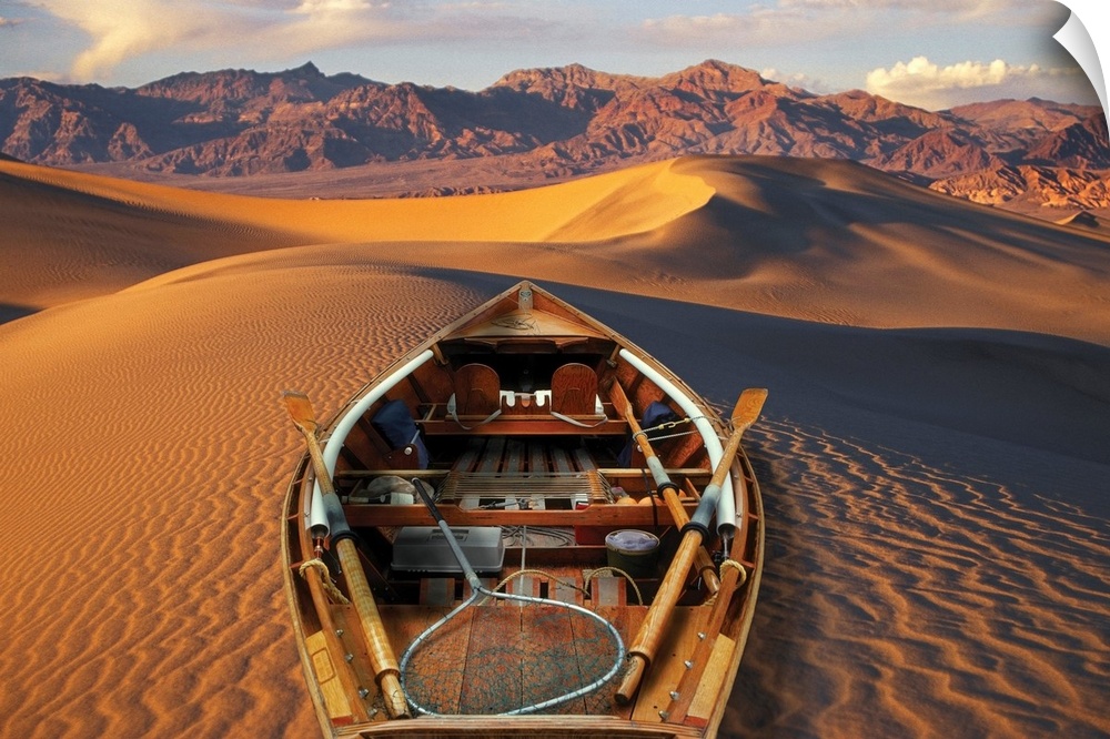 <p>Drift boat and Death Valley National Park sand dunes. Composite.</p>