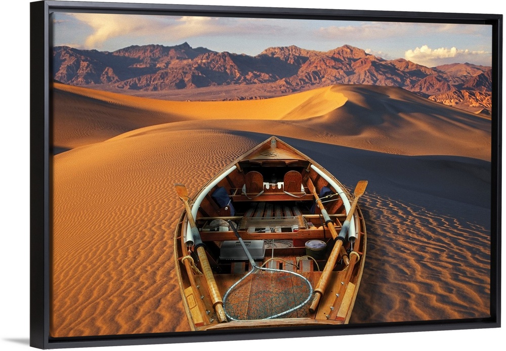 <p>Drift boat and Death Valley National Park sand dunes. Composite.</p>
