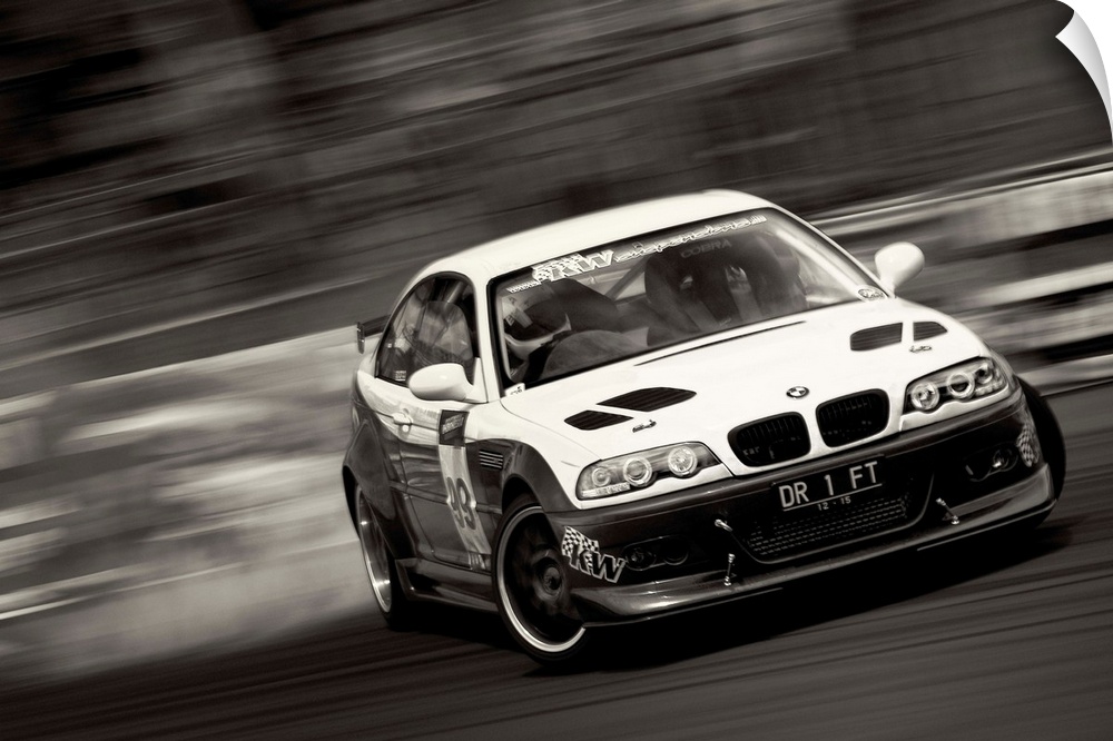 <p>A black and white photograph of a sports car drifting against a blurred background.</p>