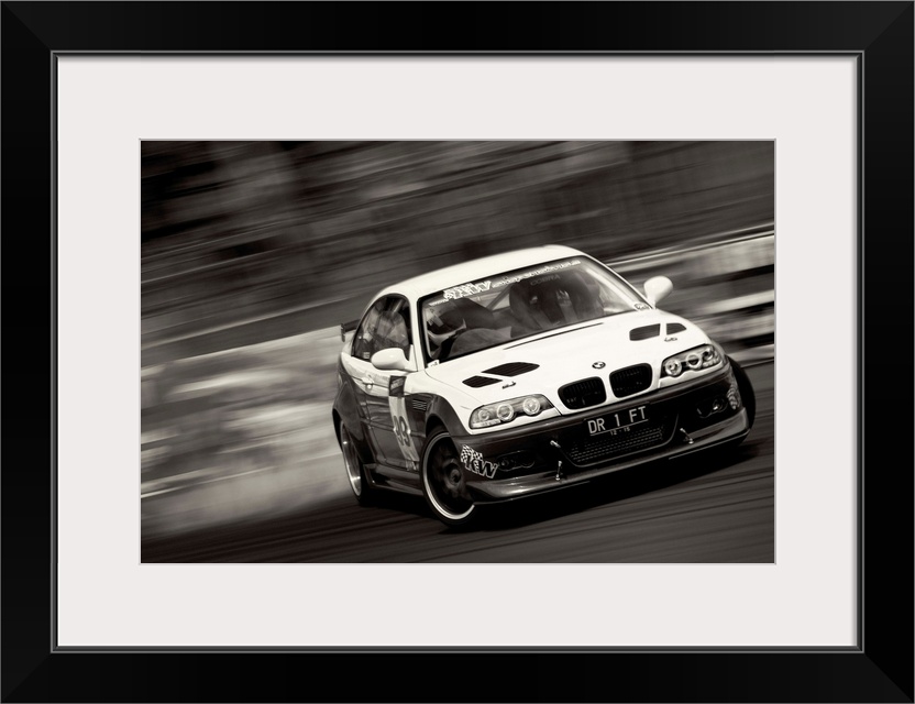 <p>A black and white photograph of a sports car drifting against a blurred background.</p>