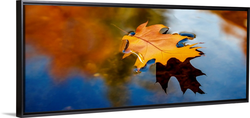 <p>A leaf floating in water reflecting fall colors.</p>