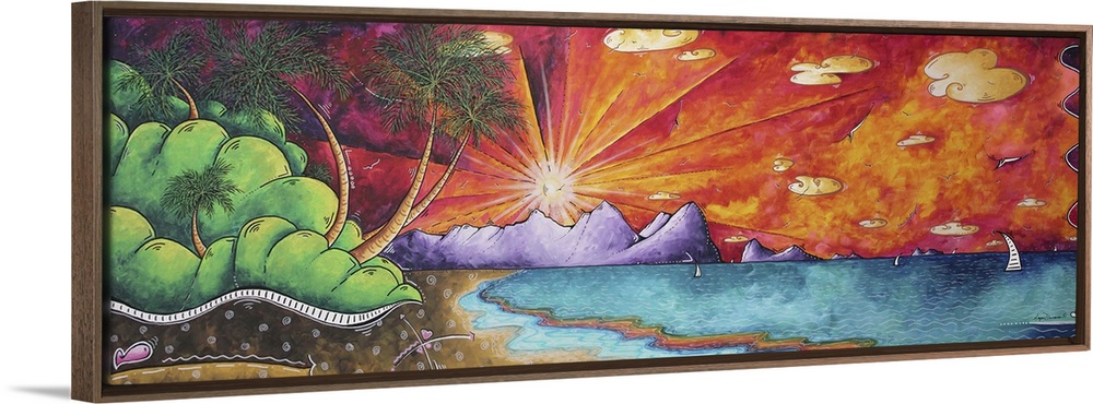 <p>Contemporary painting of the sun setting over a tropical paradise.</p>