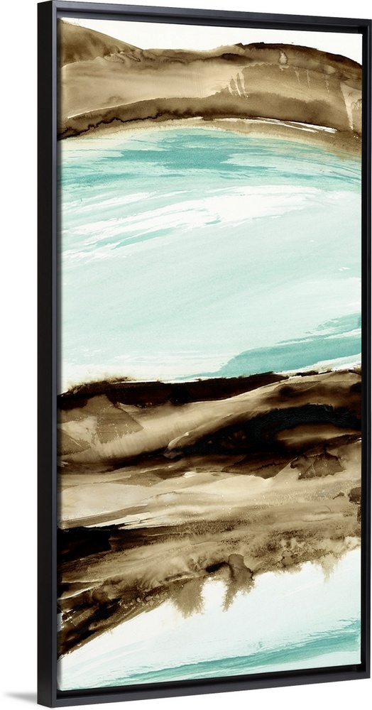 <p>Abstract watercolor artwork of brown waves over teal blue.</p>