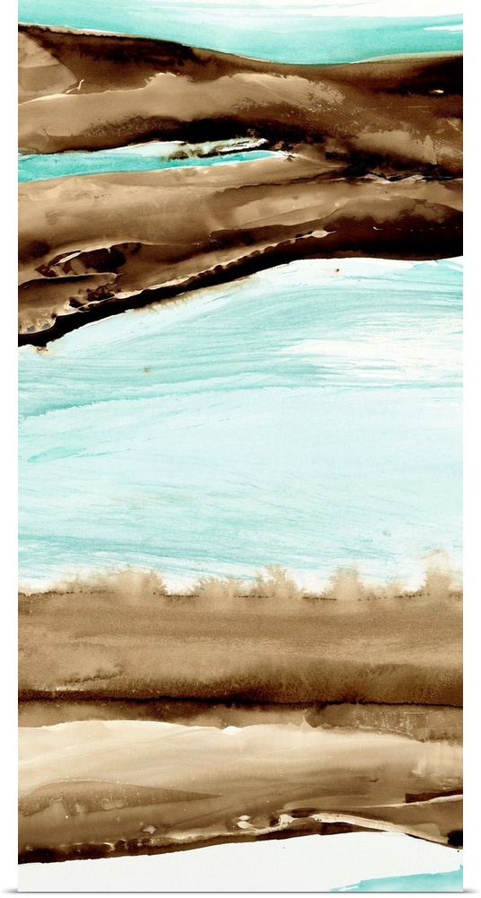 <p>Abstract watercolor artwork of brown waves over teal blue.</p>