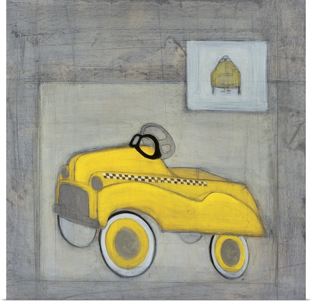 <p>Contemporary painting of bright yellow taxi cab against a gray background.</p>