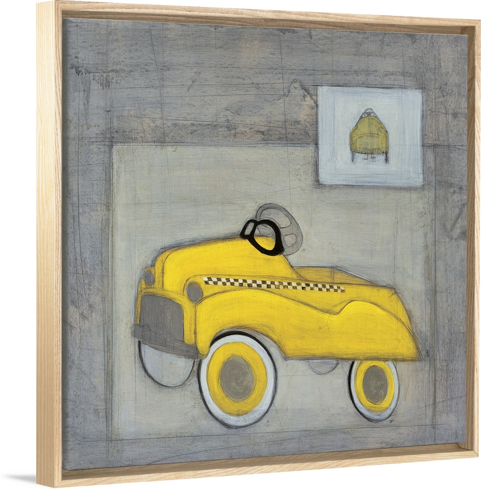 <p>Contemporary painting of bright yellow taxi cab against a gray background.</p>