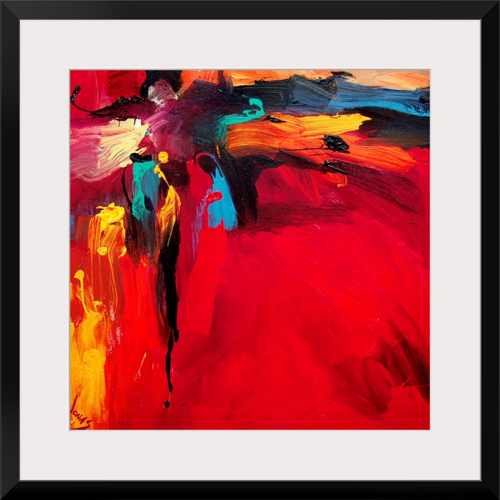 <p>Exciting contemporary painting with wild, bold brushstrokes emanating from the top left corner and flowing out onto the deep red canvas.</p>