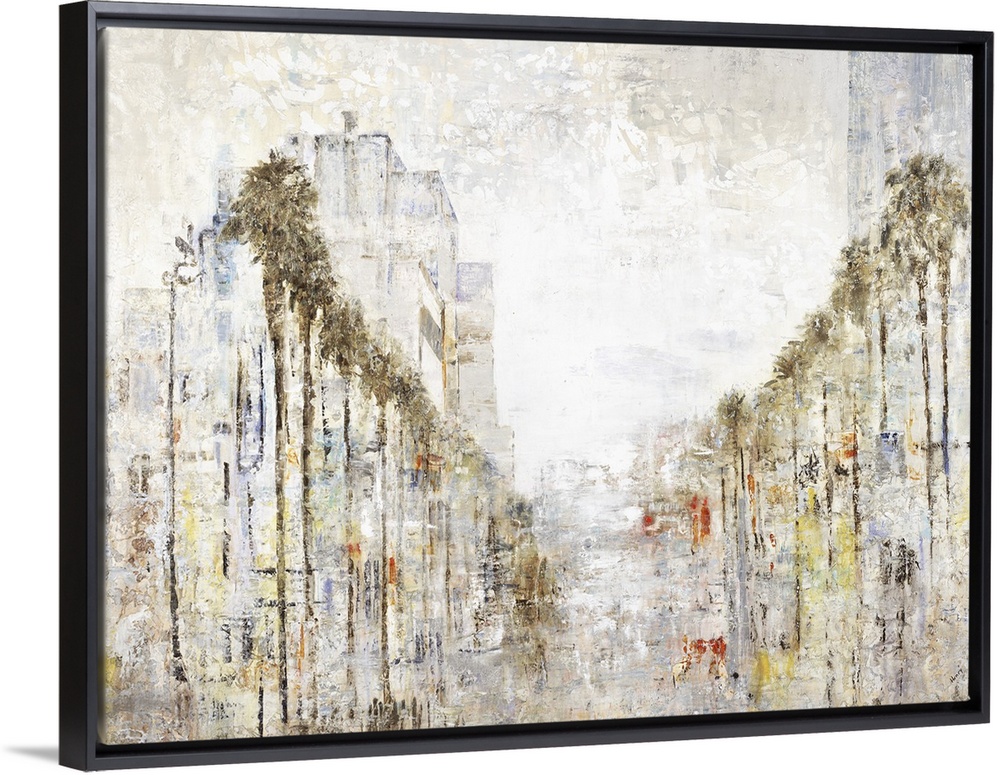 <p>Abstract painting resembling a palm tree lined street with tall buildings on the sides and in the background, created with a faded look in neutral colors with pops of yellow and orange.</p>