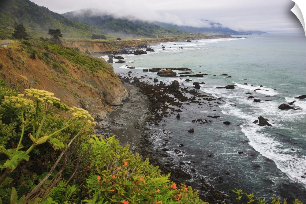 <p>Driving on Route One along the Northern California coast. Undulating coastline with craggy rock and foliage.</p>
