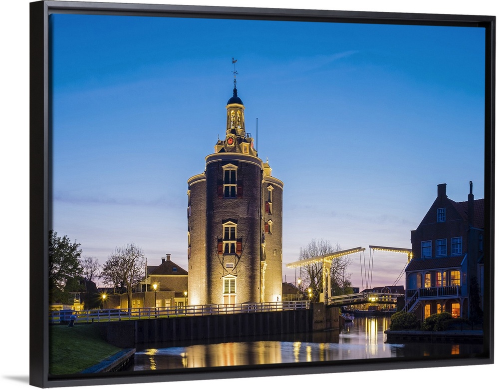 <p>Netherlands, North Holland, Enkhuizen. Drommedaris tower, historic former city gate at the entrance to Oude Haven (Old Harbor) at dusk.</p>