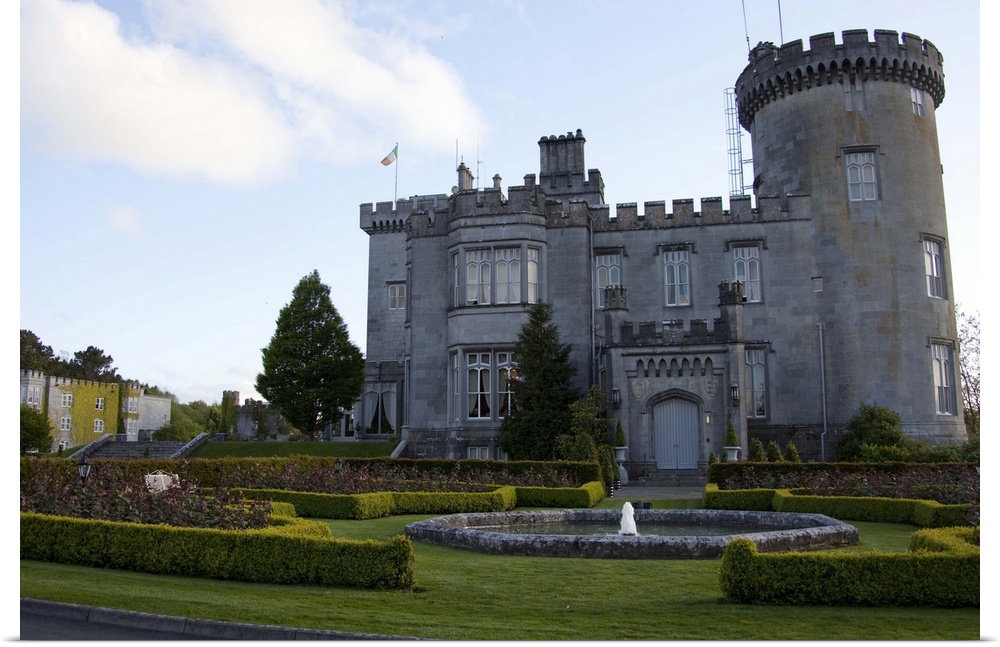 <p>Dromoland Castle Hotel in Newmaket-on-Fergus,Ireland, side view with a fountain,shrubs, lawn and trees under a blue sky with white puffy clouds,</p>