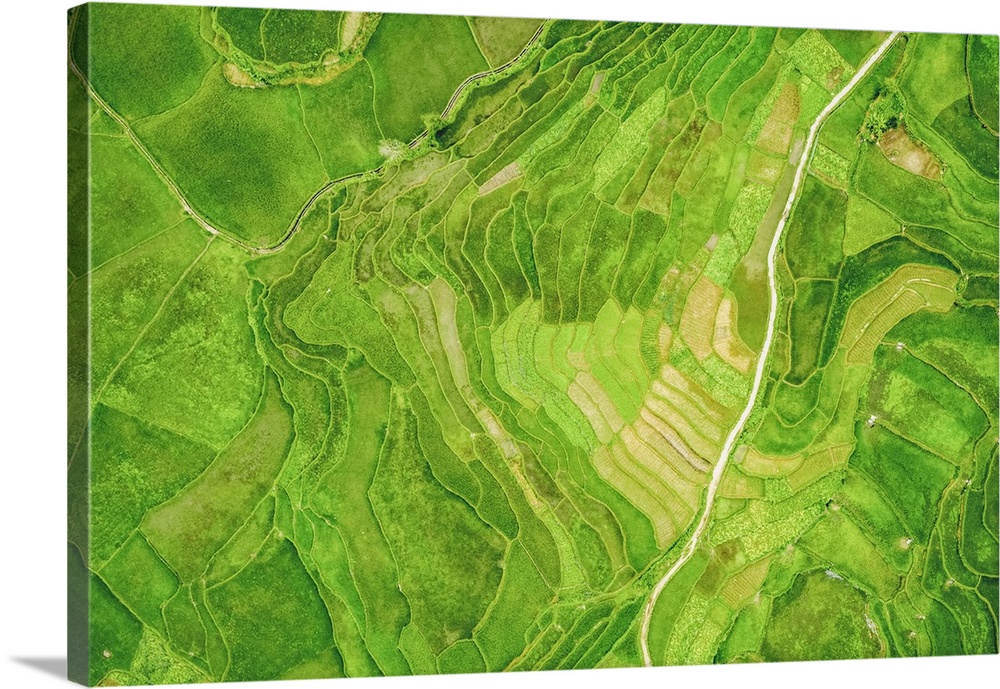 <p>Drone view of bright green, lush rice terraces; Ha Giang Province, Vietnam.</p>