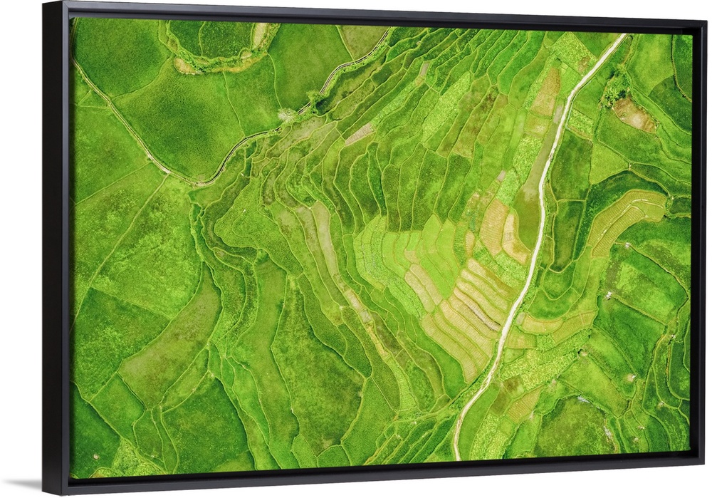 <p>Drone view of bright green, lush rice terraces; Ha Giang Province, Vietnam.</p>