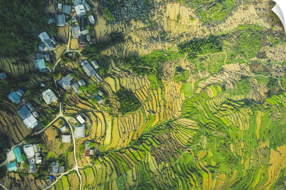 <p>Drone view of rice terraces; Ha Giang Province, Vietnam.</p>