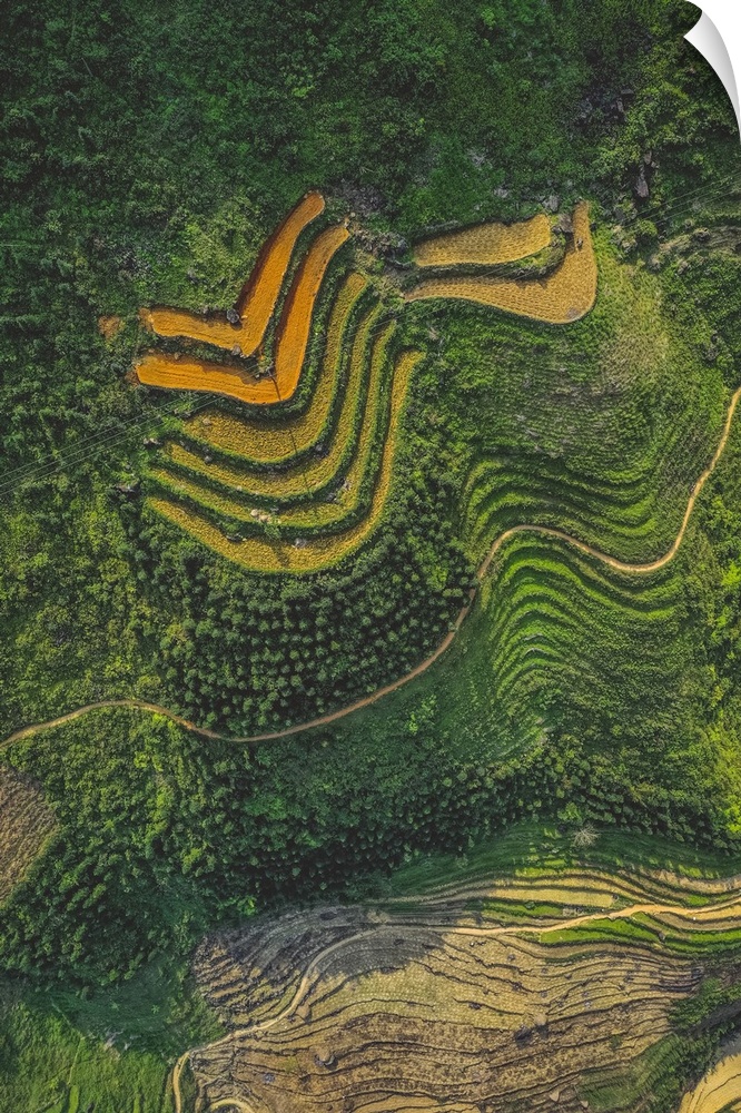 <p>Drone view of rice terraces on the lush mountainside; Ha Giang Province, Vietnam.</p>