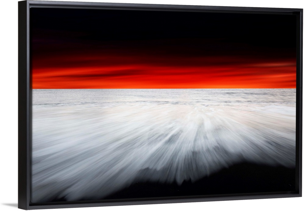 <p>A dramatic photograph of a blazing sky hanging over a white seascape seen from a black sand beach.</p>