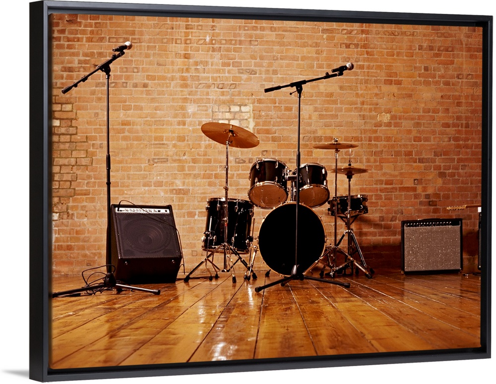 <p>Photograph of musical instruments including a snare drum, bass, high hat cymbal, and crash cymbal with amp and audio equipment sitting on a wood floor with a brick wall in the background.</p>