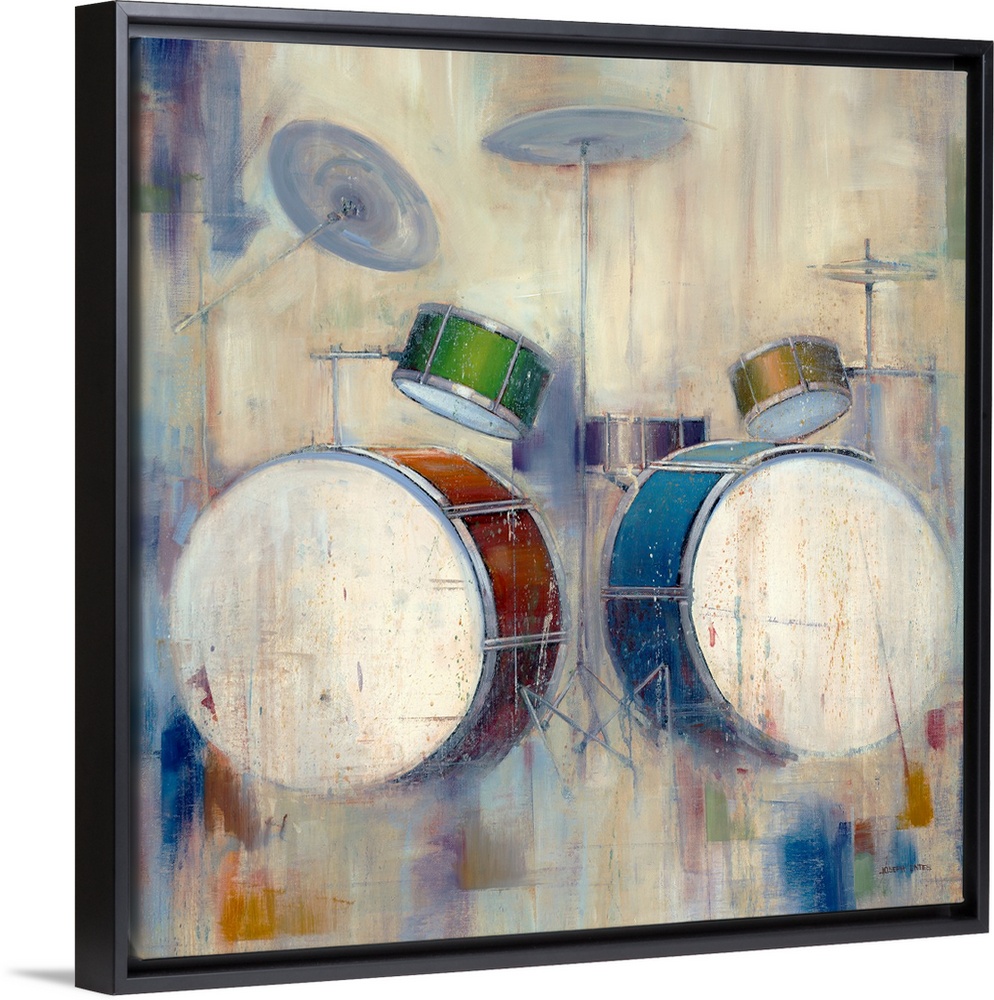 <p>Square oversized artwork of a colorful drum set with symbols, the edges fading into a patchy, heavily brush stroked background with pops of vibrant color.</p>