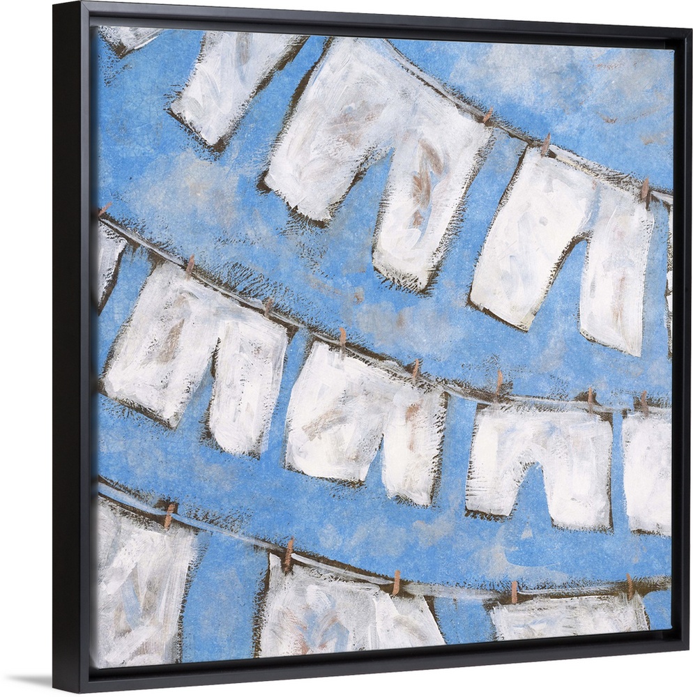 <p>Contemporary painting of rows of white shorts drying on laundry lines.</p>