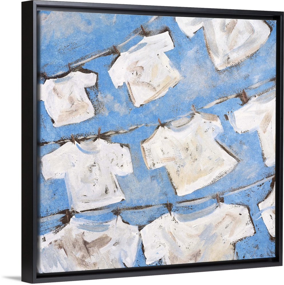 <p>Contemporary painting of rows of white shirts drying on laundry lines.</p>
