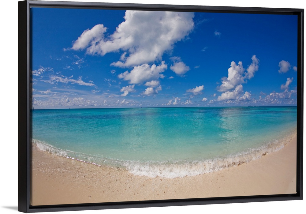 <p>Perfect beach day with blue skies, clear water, puffy white clouds.</p>