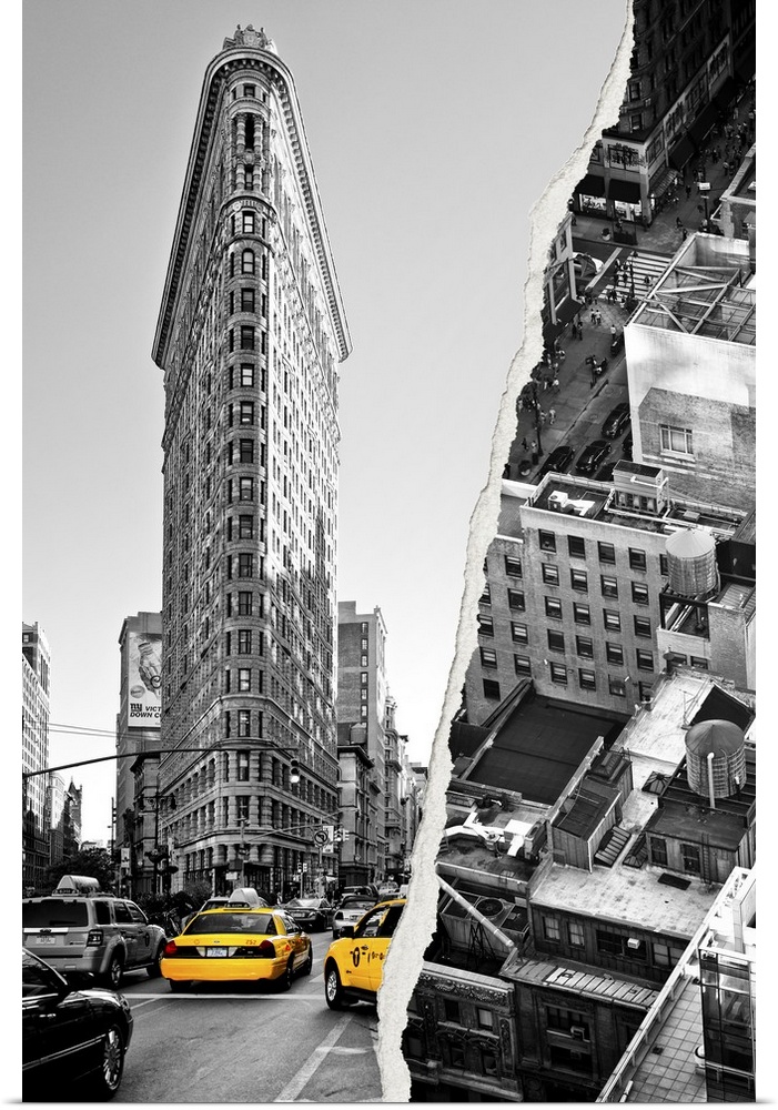 <p>Two torn photographs of New York city landmark sites put together to make one image.</p>