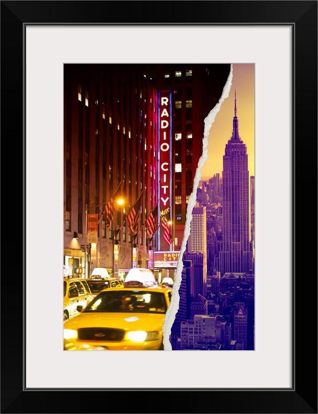 <p>Two torn photographs of New York city landmark sites put together to make one image.</p>