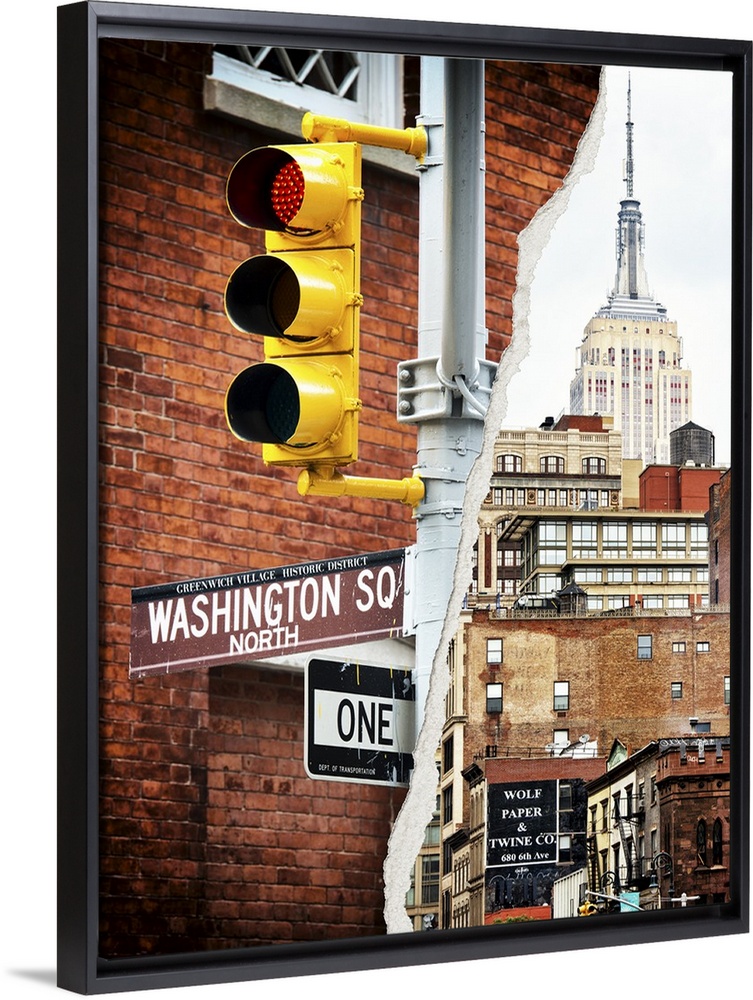 <p>Two torn photographs of New York city landmark sites put together to make one image.</p>